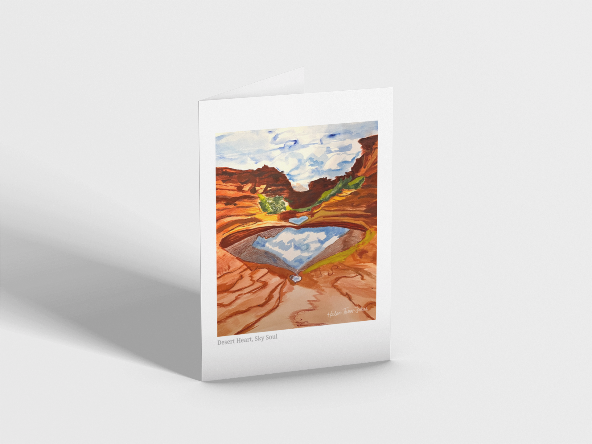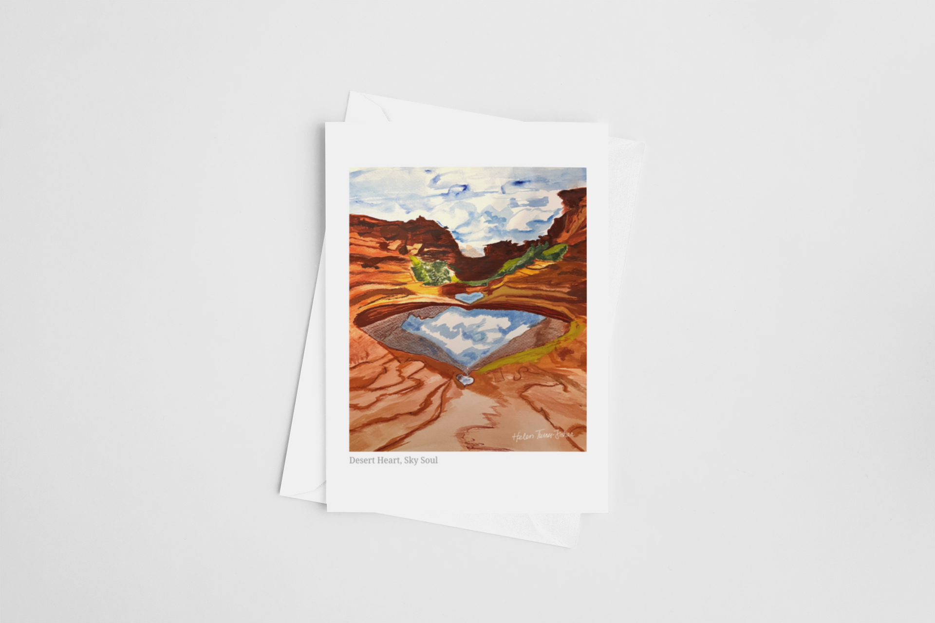 Featuring the stunning artwork Desert Heart, Sky Soul, this greeting card captures the quiet majesty of the desert—where rust-red canyon walls cradle shimmering heart-shaped pools that mirror the boundless sky. Painted with a vivid, dreamlike quality, this piece evokes themes of inner reflection, emotional depth, and nature’s sacred balance.