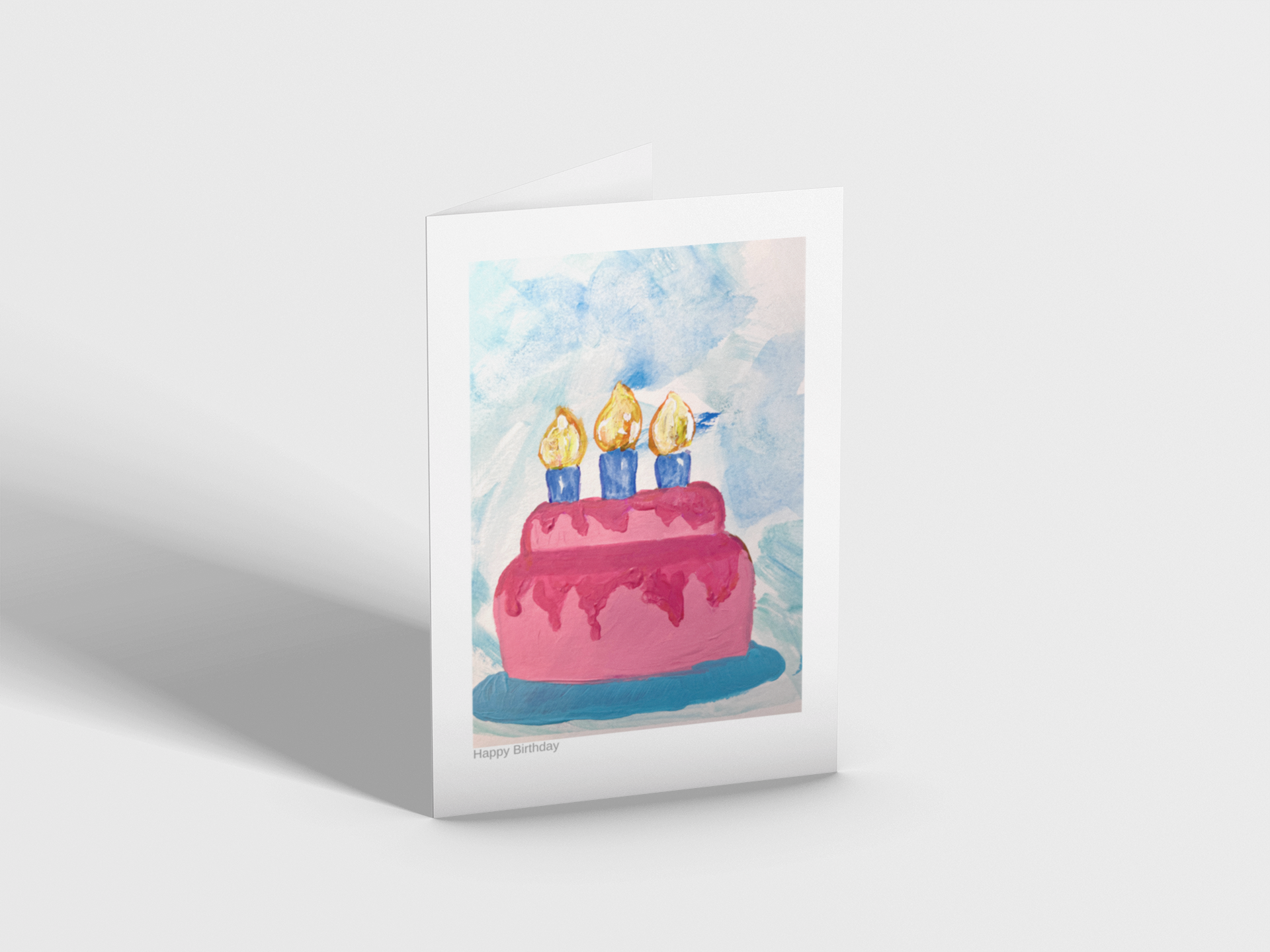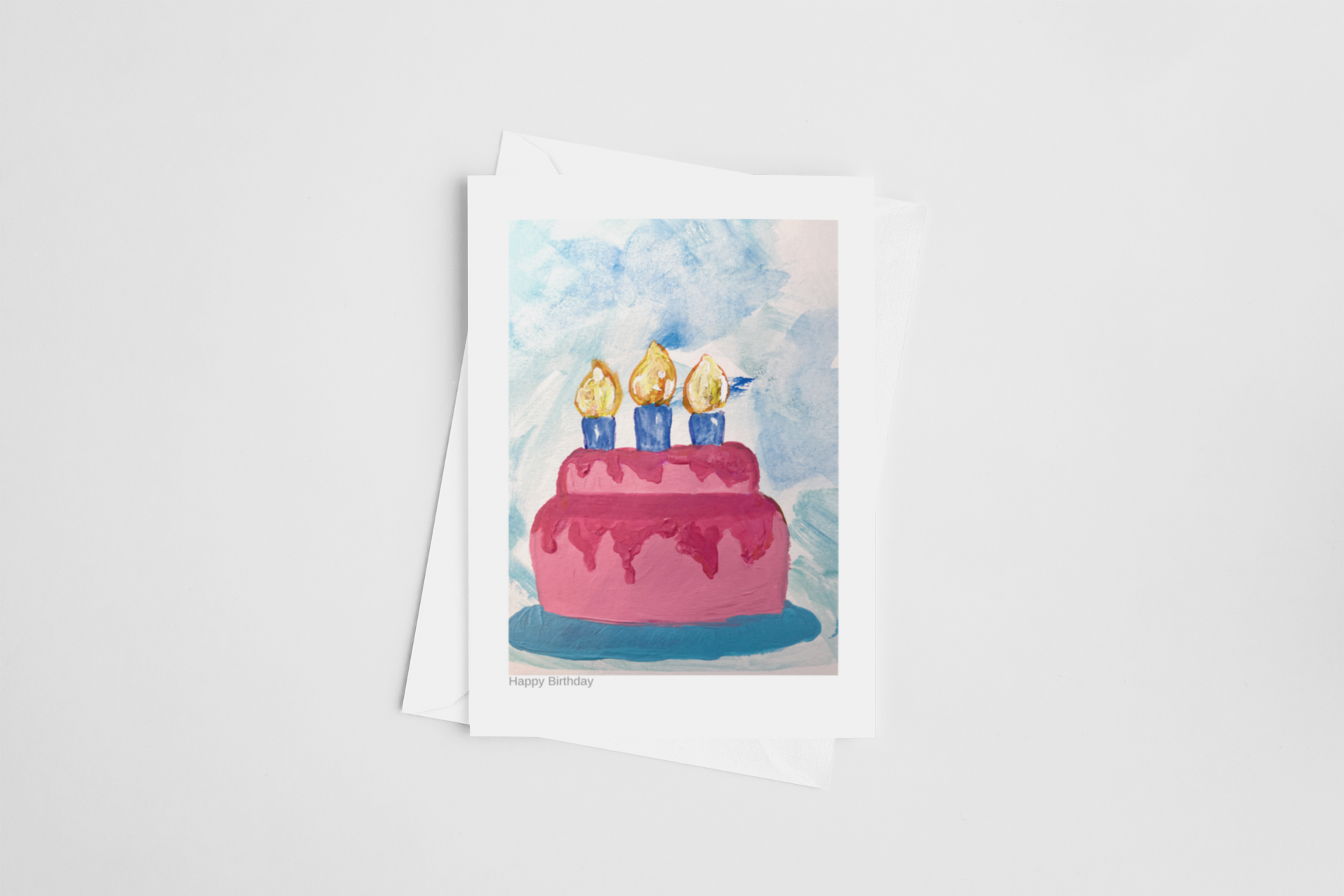 Sweet, simple, and full of joy — Happy Birthday is a celebration on paper. This hand-painted piece features a vibrant pink cake topped with three glowing candles, set against a dreamy sky of soft blues and swirling brushstrokes. It's playful, heartfelt, and just the right touch of whimsy for someone's special day.