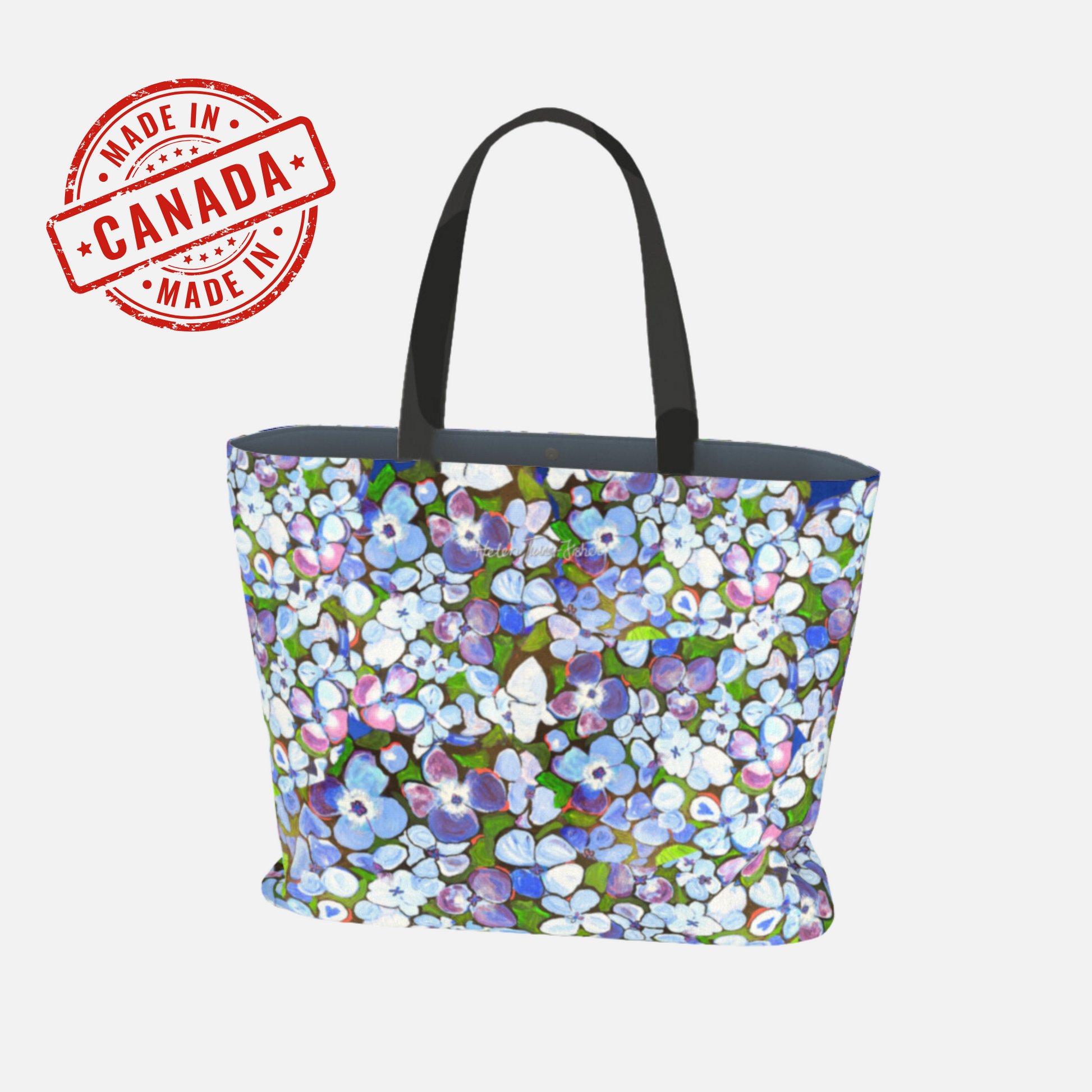 Designed and made in Canada, this tote features “Hydrangea Love,” a vibrant floral pattern based on Helen’s original artwork. Bursting with purples, blues, and soft whites, the blooming hydrangeas bring a joyful splash of colour to your everyday adventures.