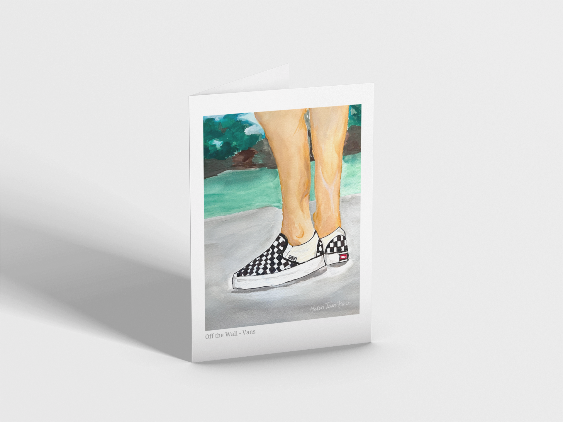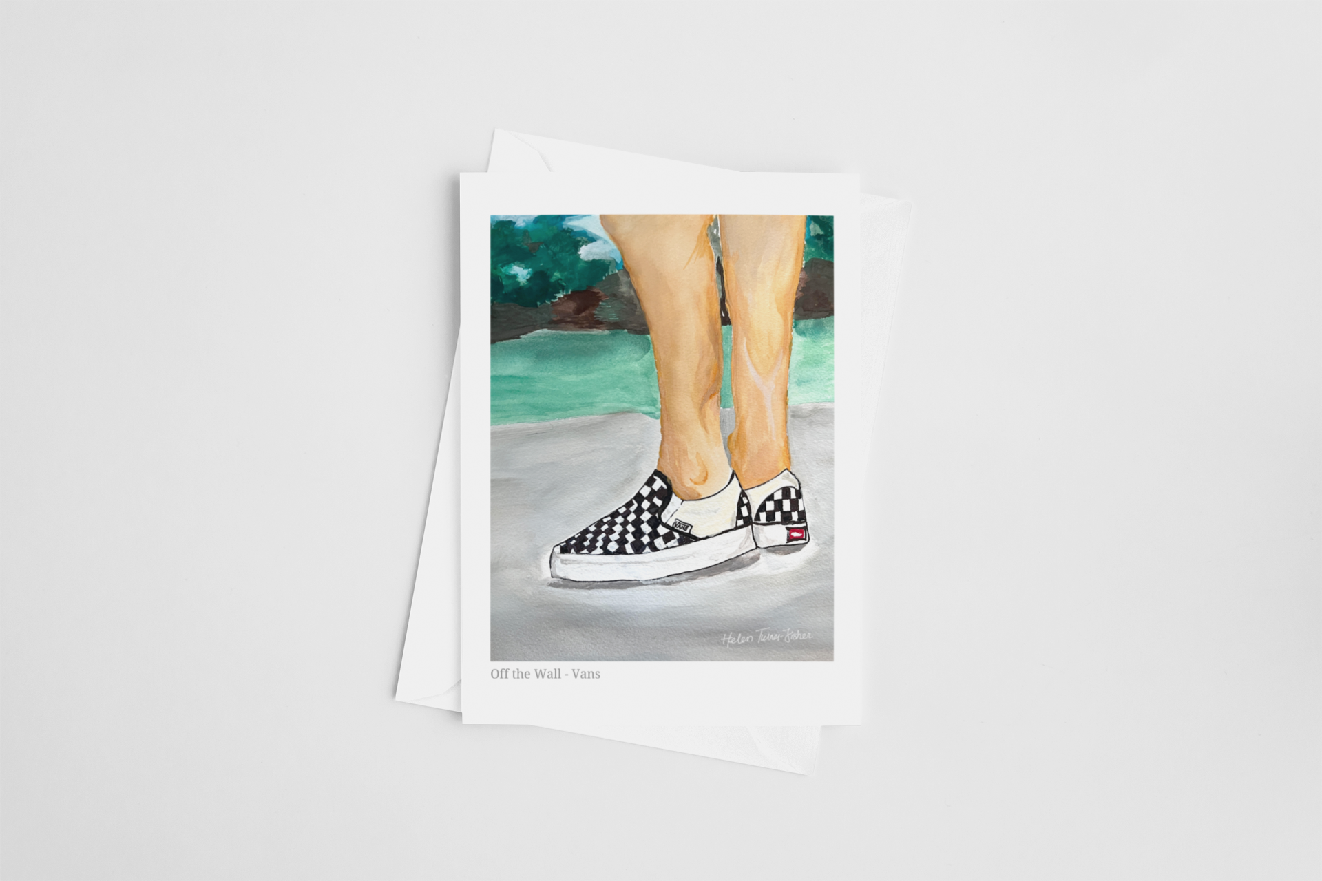 Cool, classic, and effortlessly bold—Off the Wall-Vans celebrates the spirit of street style with a nod to the iconic checkerboard Vans. This watercolour design captures a quiet moment that says it all: relaxed confidence, sun-warmed pavement, and that unmistakable "off-duty" attitude.
