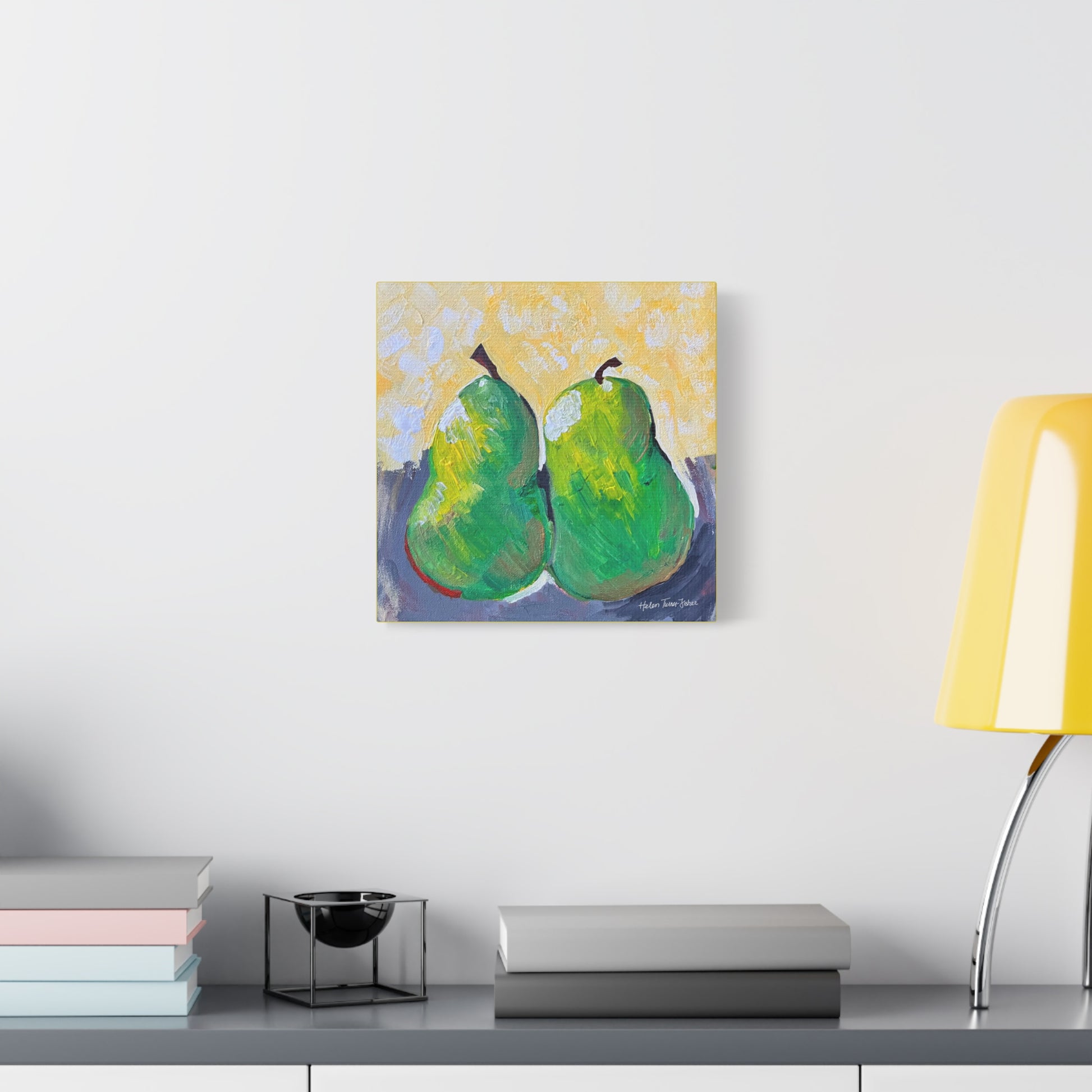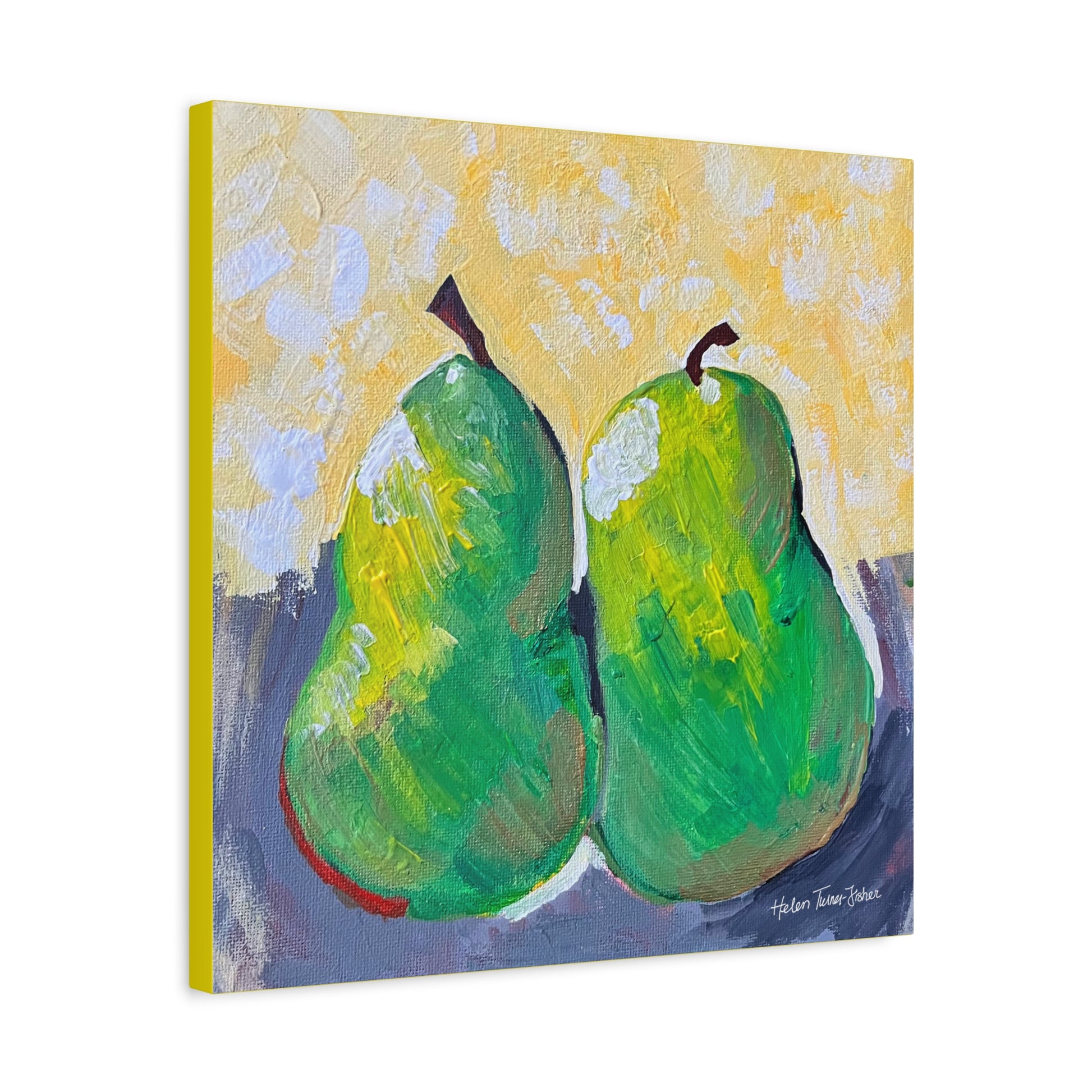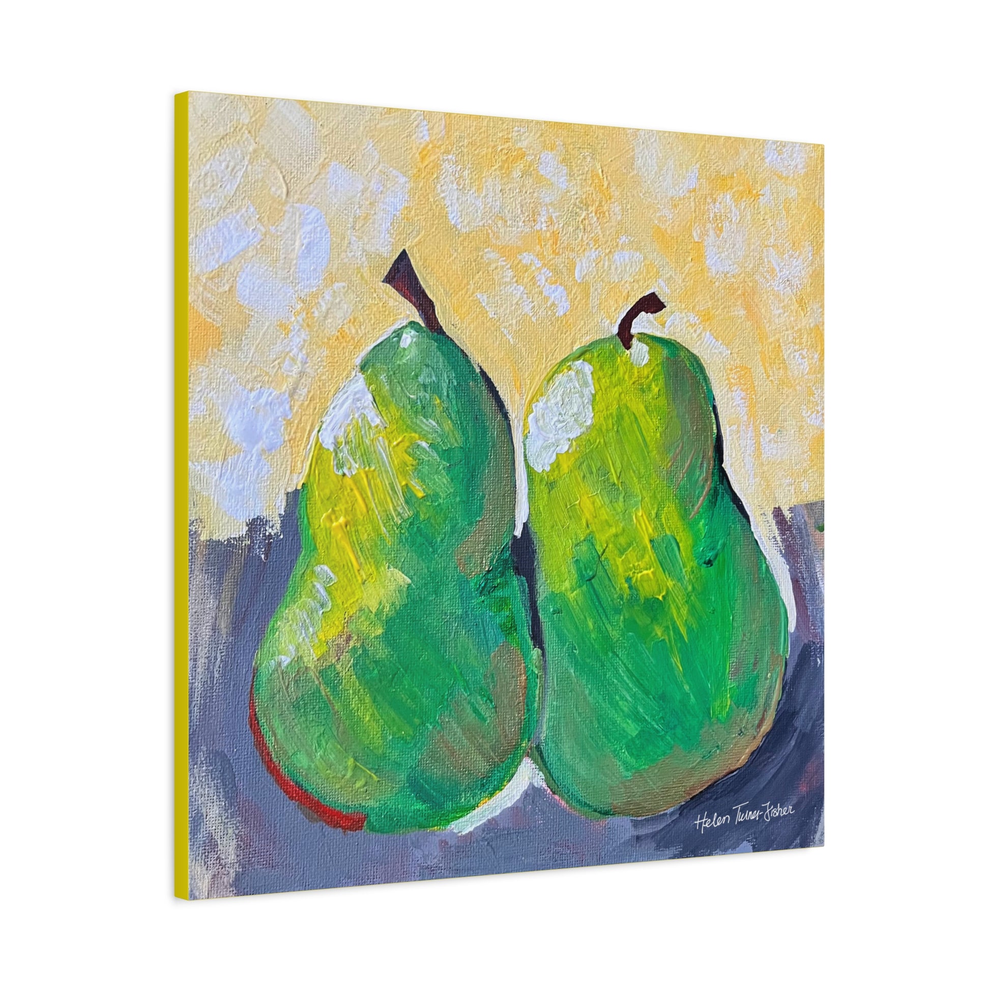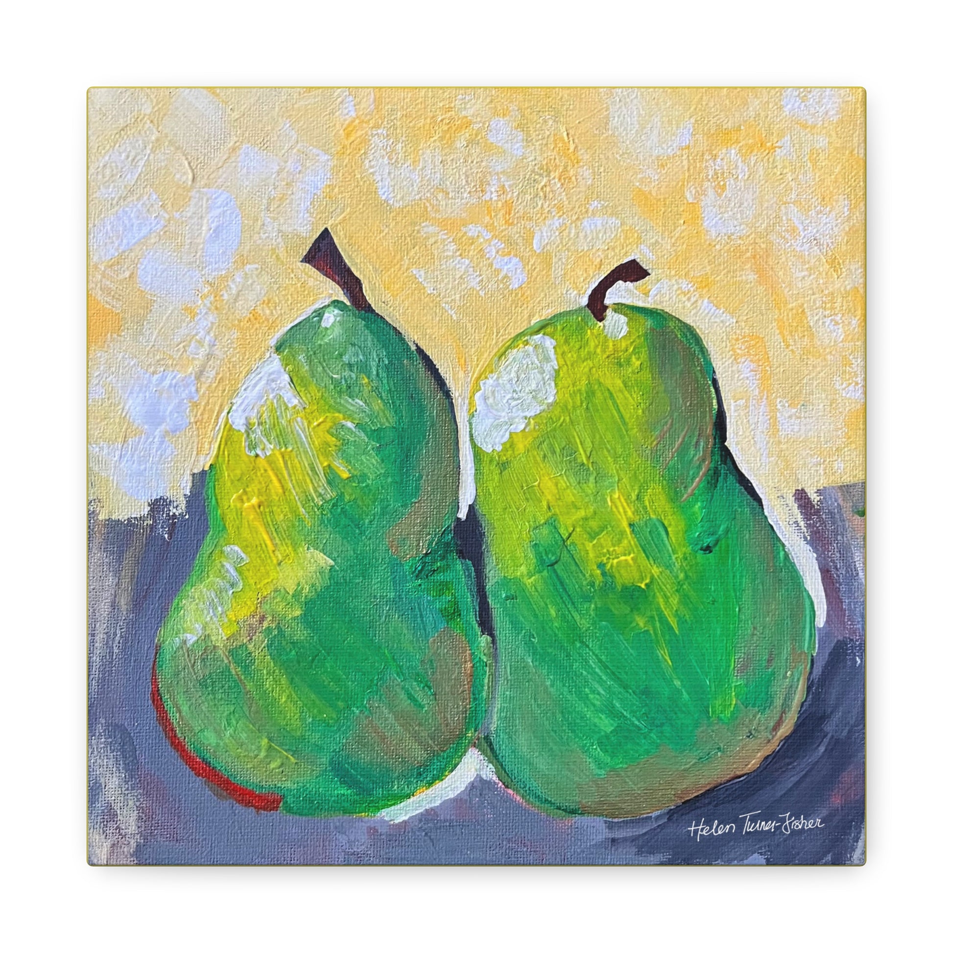 Simple, sweet, and full of character, Pair of Pears by Helen Turner-Fisher captures the beauty of everyday still life with bold brushstrokes and vibrant colour. Two ripened pears, side by side, lean gently into each other — a quiet symbol of connection, companionship, and the joy found in life’s humble details.