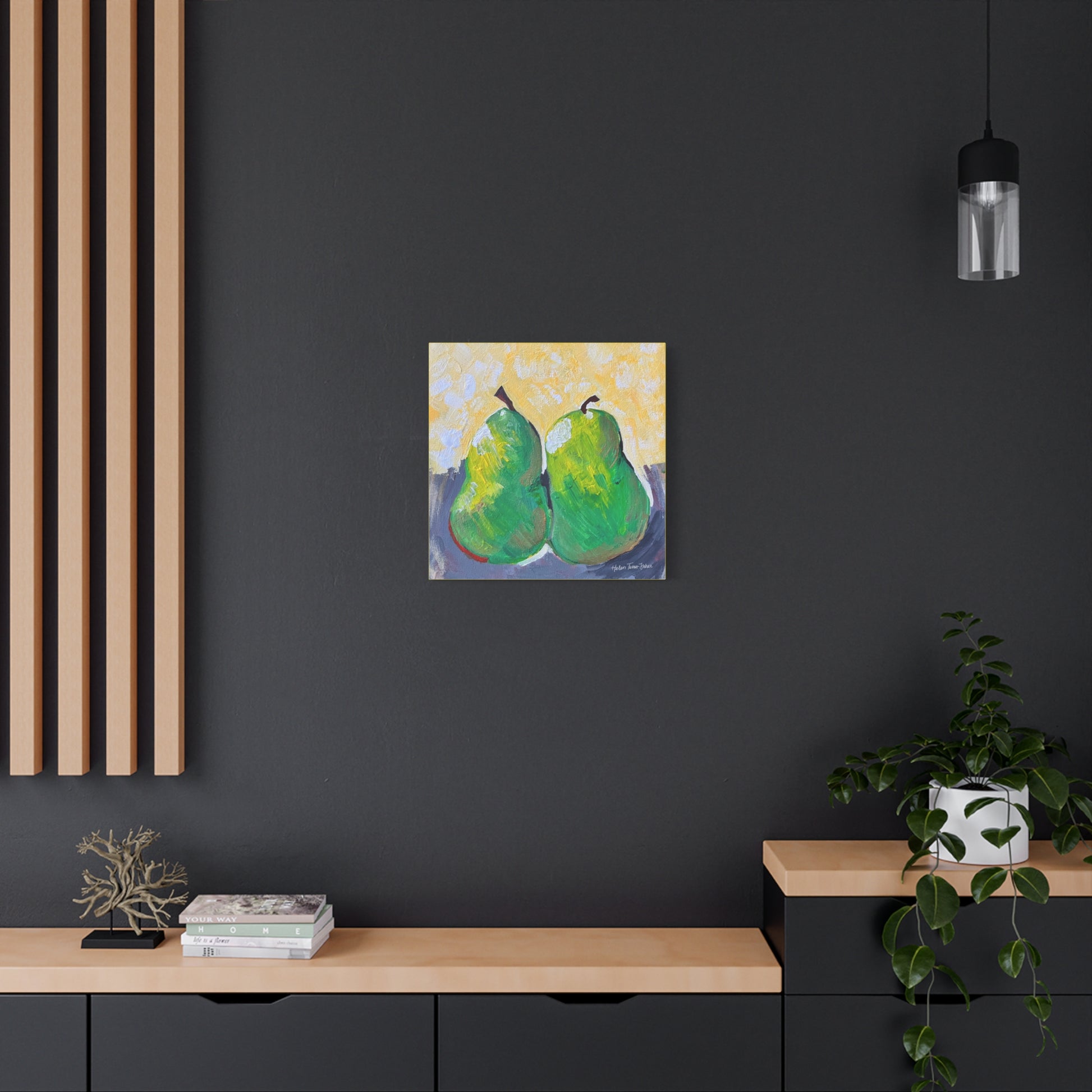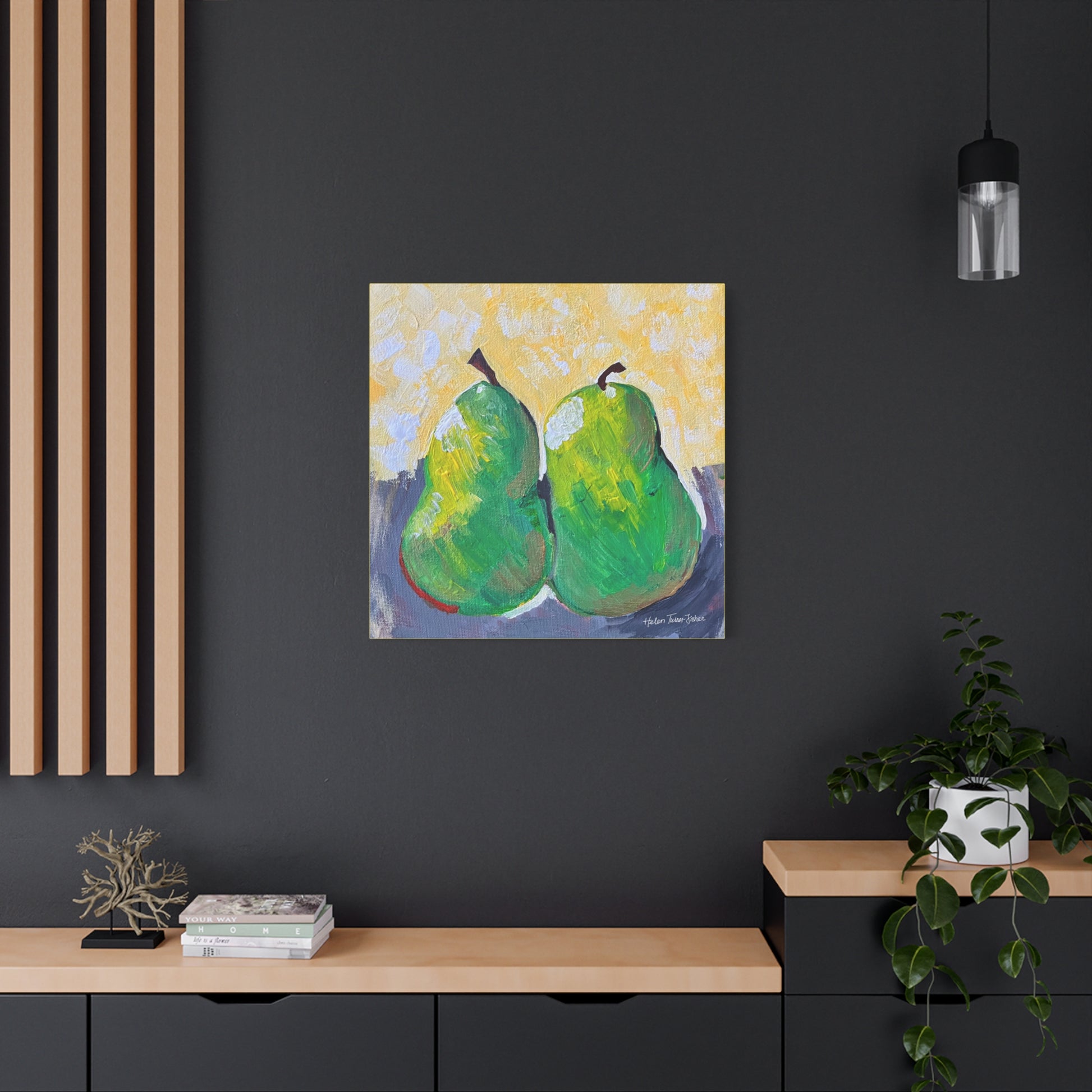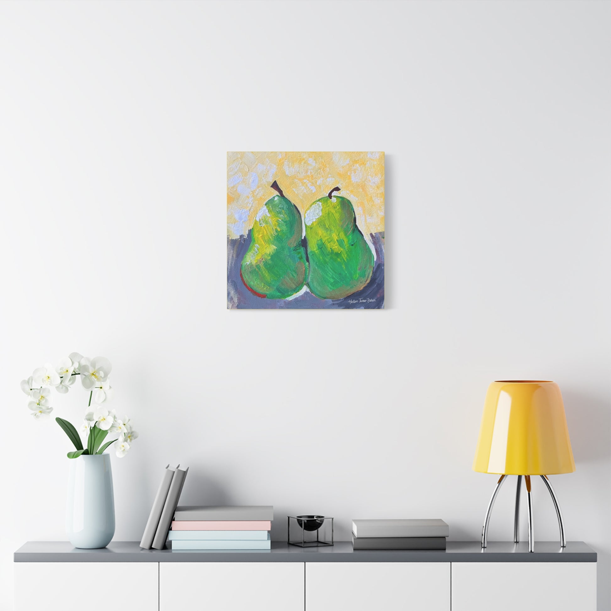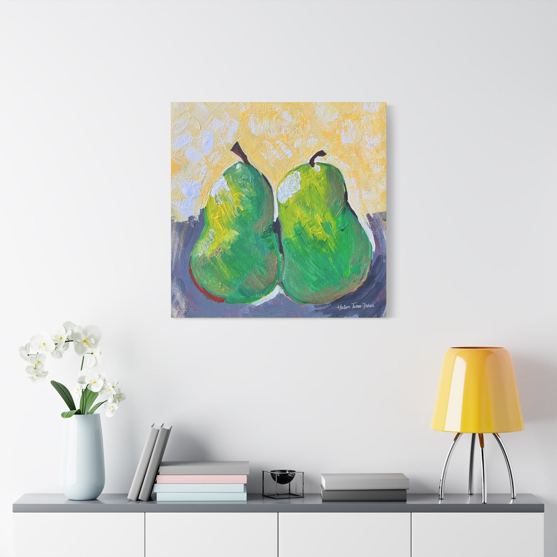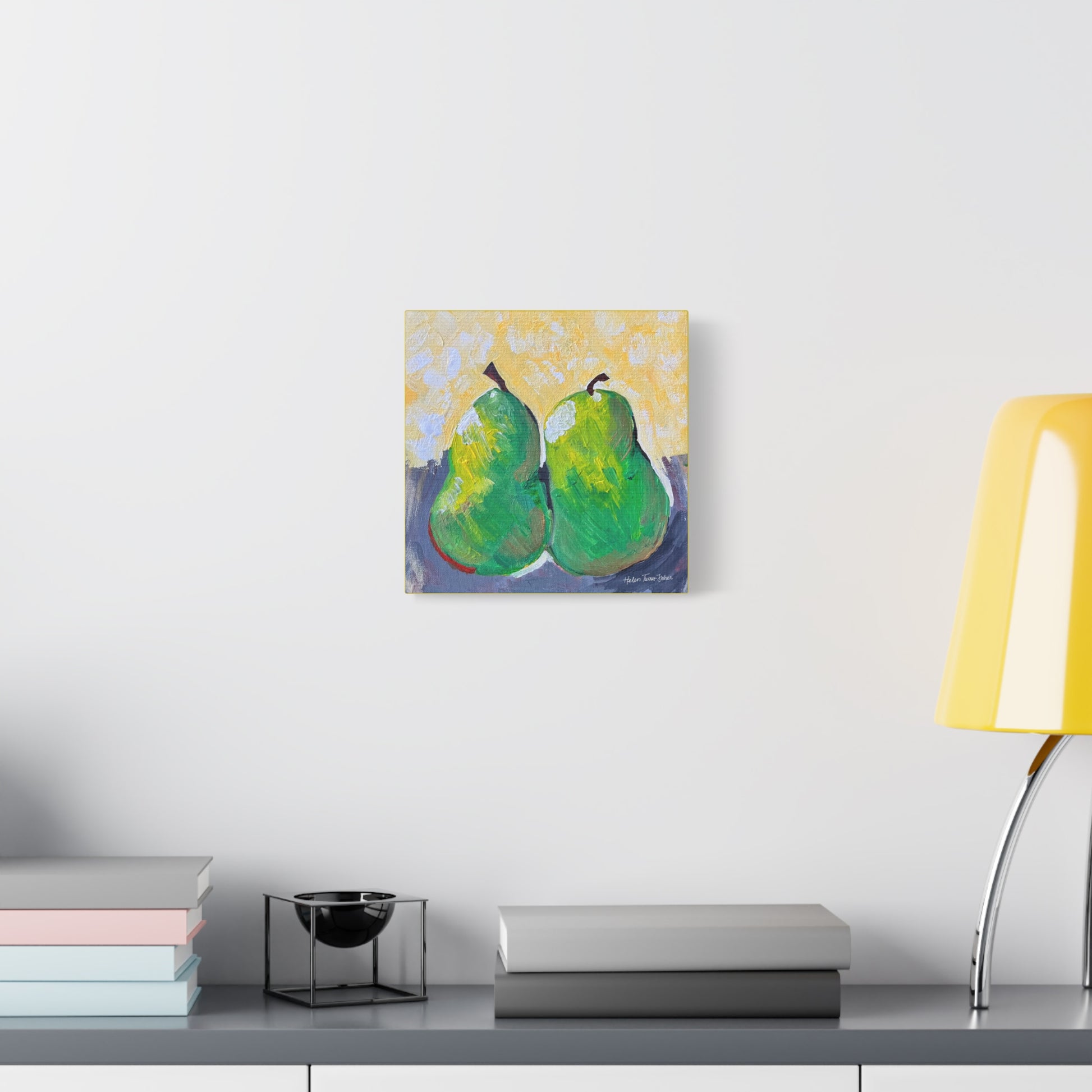 Simple, sweet, and full of character, Pair of Pears by Helen Turner-Fisher captures the beauty of everyday still life with bold brushstrokes and vibrant colour. Two ripened pears, side by side, lean gently into each other — a quiet symbol of connection, companionship, and the joy found in life’s humble details.