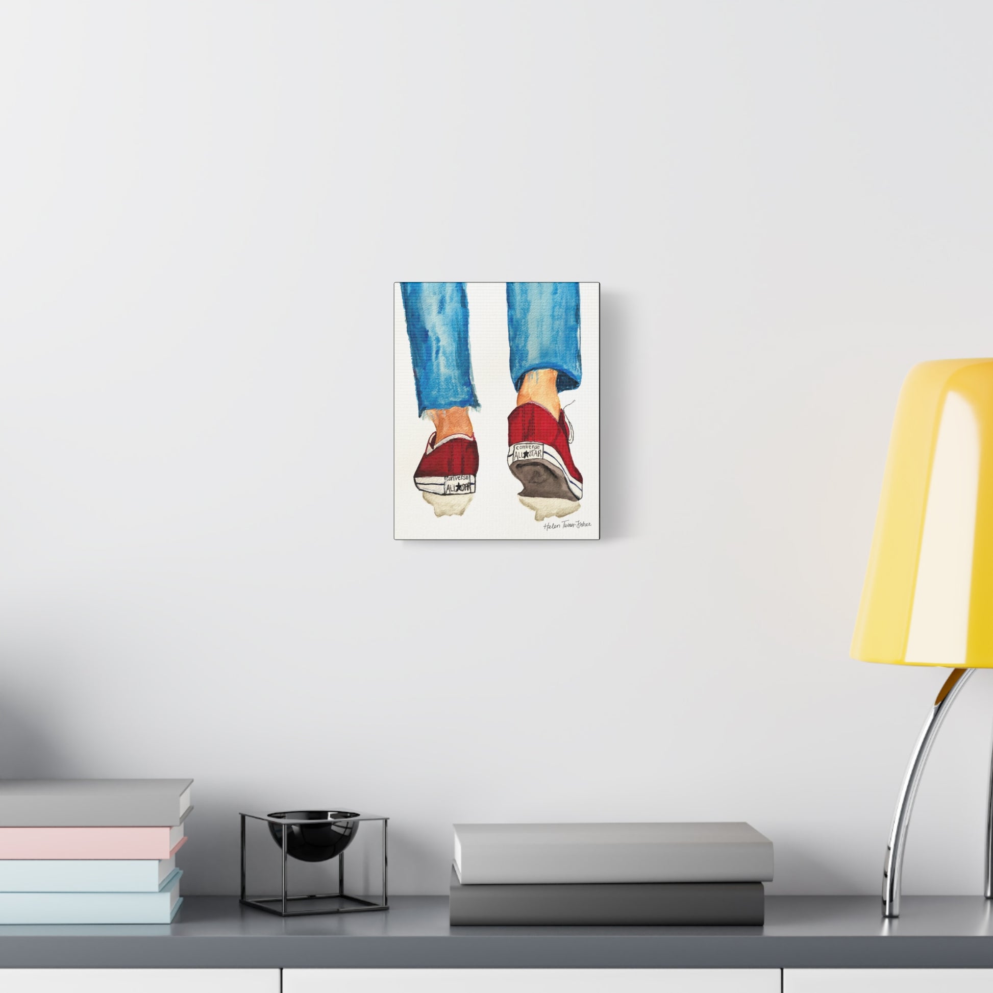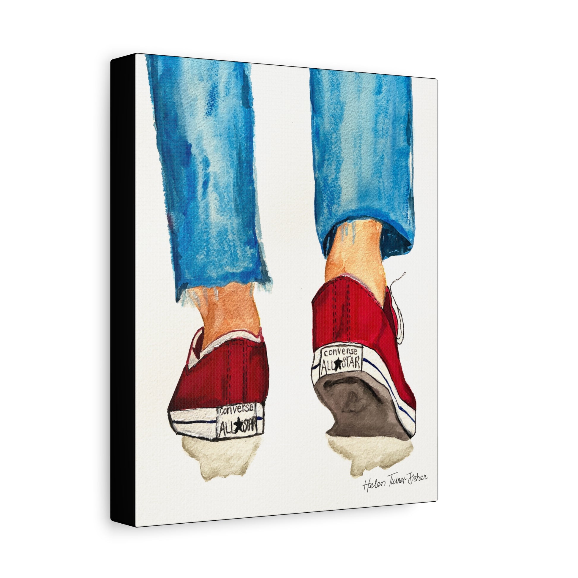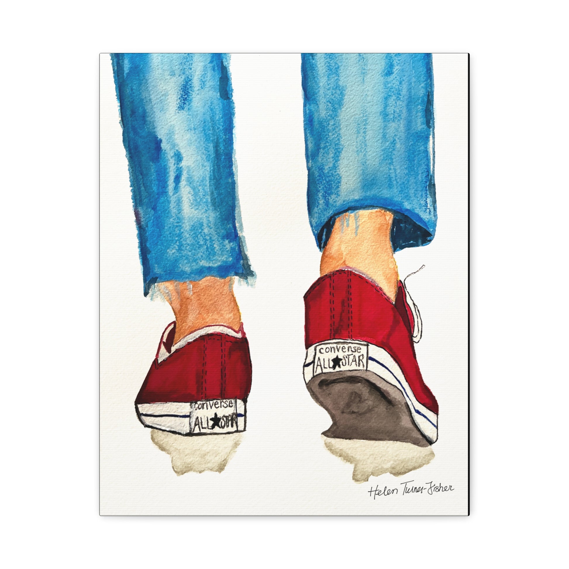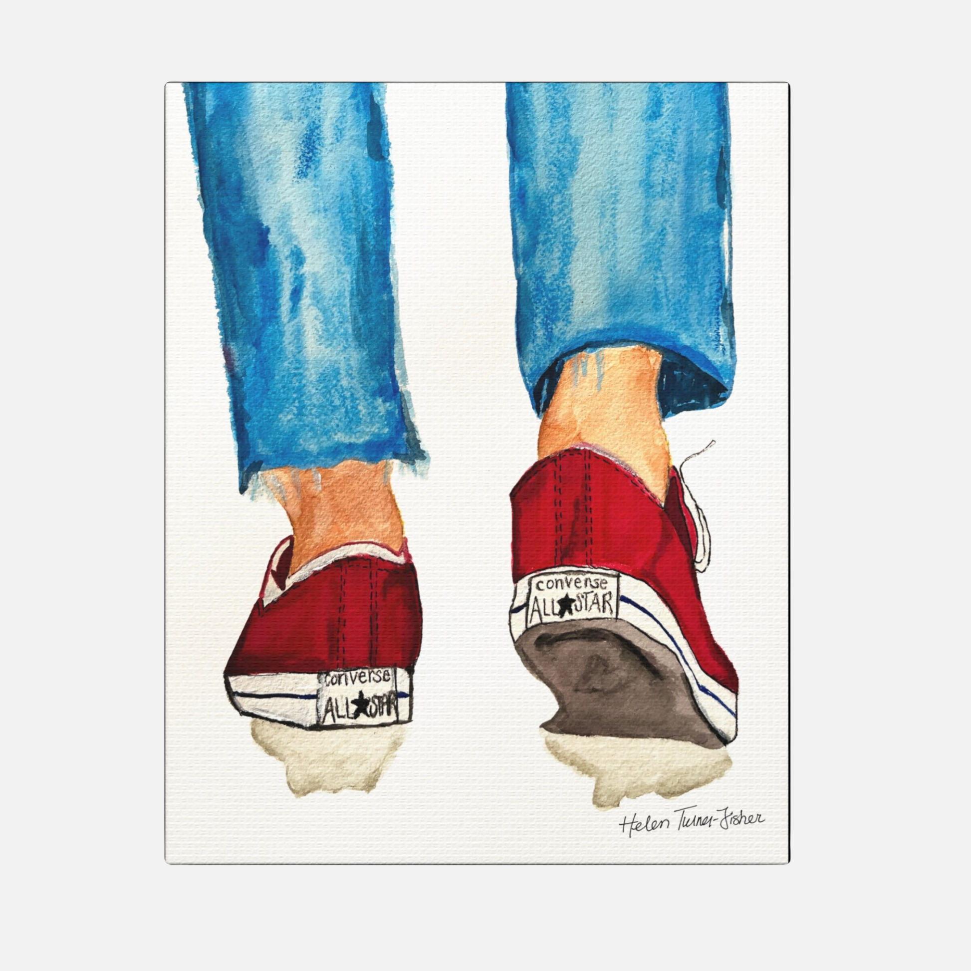 There’s something iconic about a well-worn pair of Chucks. Timeless Stride, based on an original painting by Helen Turner-Fisher, captures that carefree, confident moment of motion — the easy sway of denim, the bold flash of red, the steady rhythm of a life in step. It’s a nostalgic nod to youthful independence and everyday adventures, frozen in watercolour.
