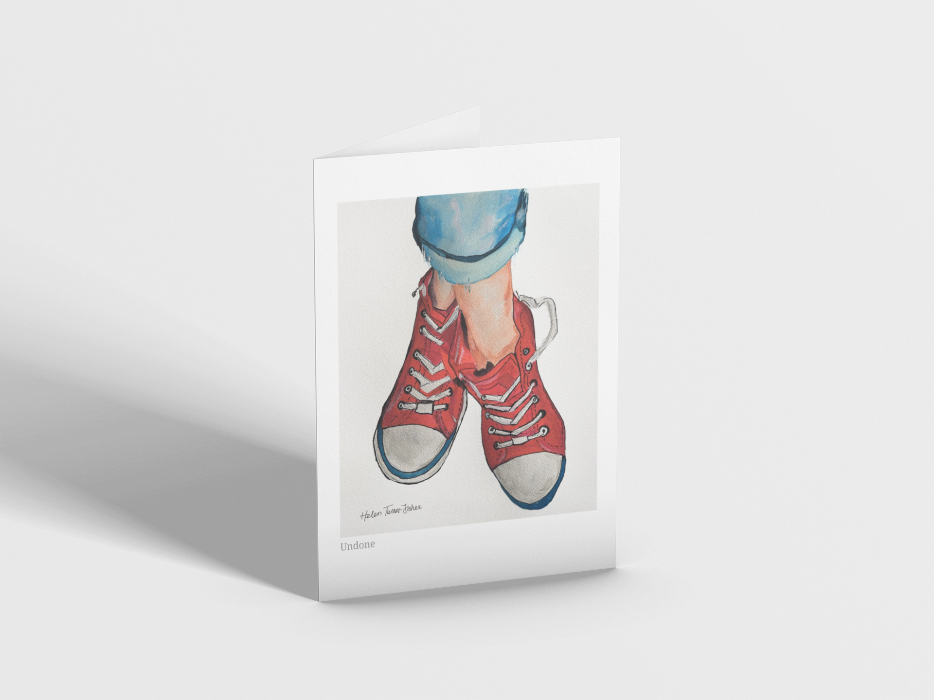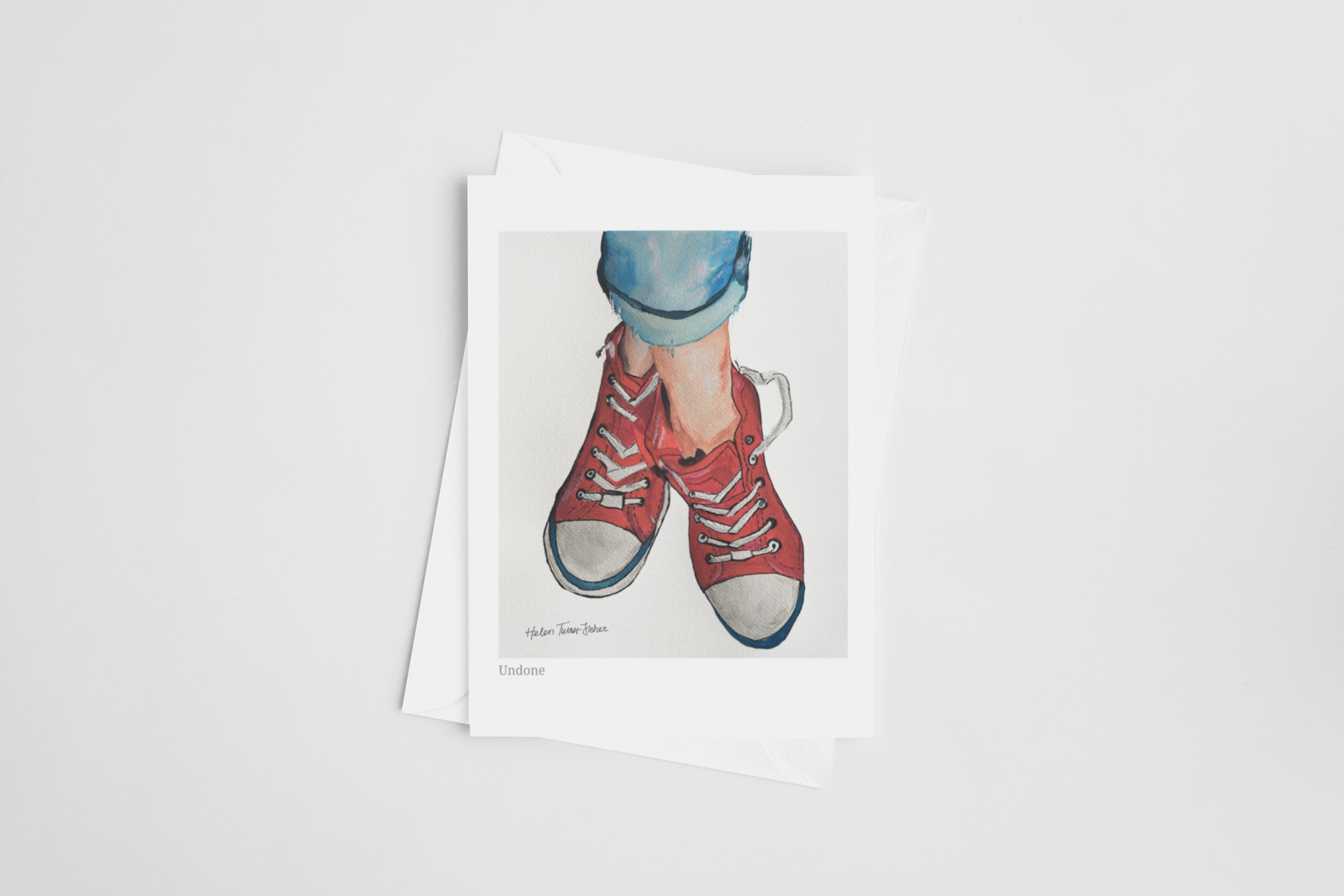 Bold, carefree, and just a little rebellious—Undone captures a moment of laid-back confidence in vivid watercolour. With worn red sneakers, untied laces, and rolled denim, this artwork brings a touch of retro spirit and youthful freedom to the everyday.